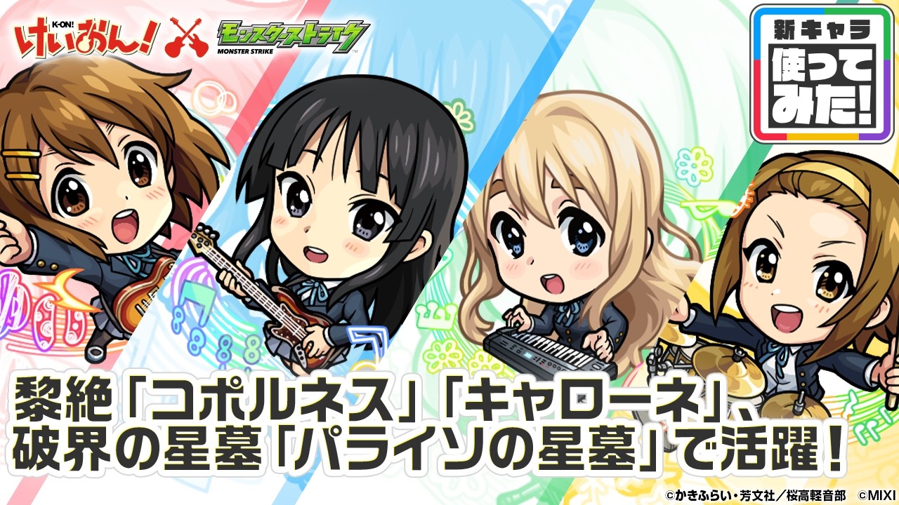 【アニメ『けいおん!』×モンスト】平沢 唯、秋山 澪、琴吹 紬、田井中 律 登場!黎絶「コポルネス」「キャローネ」、破界の星墓「パライソの星墓」で活躍!【新キャラ使ってみた|モンスト公式】